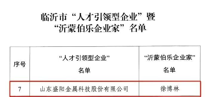 其中,山東盛陽金屬科技被評(píng)選為“人才引領(lǐng)型企業(yè)”,集團(tuán)總裁徐博林被授予“沂蒙伯樂企業(yè)家”榮譽(yù)稱號(hào)。